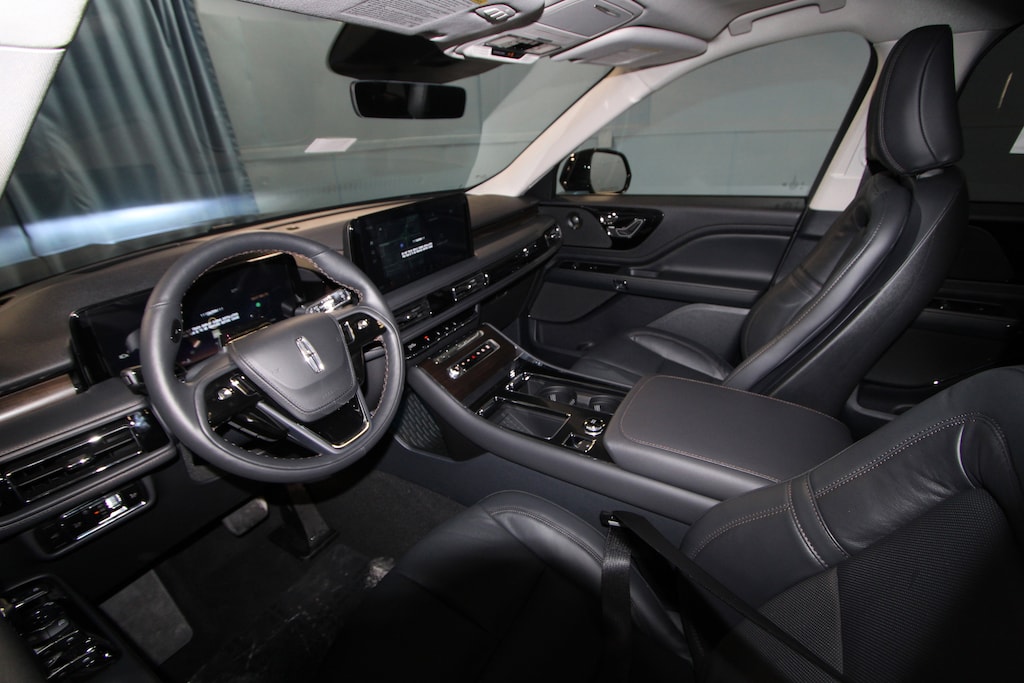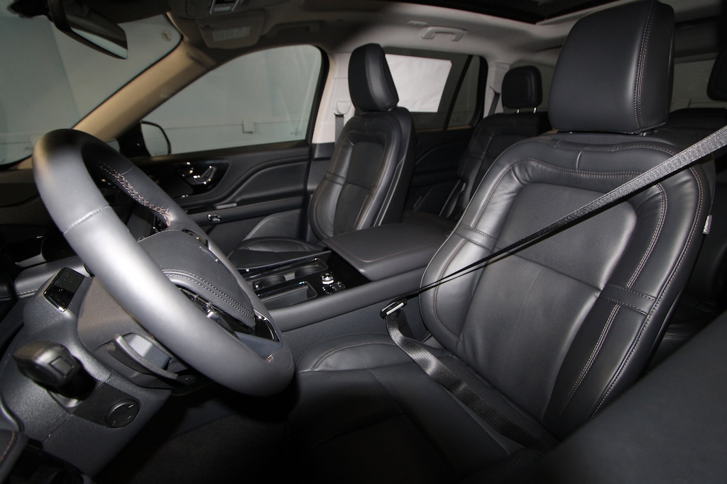 14 Speakers, 3rd row seats: split-bench, 4-Wheel Disc Brakes, 40/Mini Console/40 Dual Captain's Chairs, ABS brakes, Adaptive suspension, Air Conditioning, All-Weather 1st and 2nd Row Floor Liners, Alloy wheels, AM/FM radio: SiriusXM, Apple CarPlay/Android Auto, Audio memory, Auto Heated and Ventilated Driver and Passenger Seats, Auto High-beam Headlights, Auto-dimming door mirrors, Auto-dimming Rear-View mirror, Automatic temperature control, Brake assist, Bumpers: body-color, Compass, Delay-off headlights, Driver door bin, Driver vanity mirror, Dual front impact airbags, Dual front side impact airbags, Electronic Stability Control, Emergency communication system: 911 Assist, Four wheel independent suspension, Front anti-roll bar, Front Bucket Seats, Front Center Armrest, Front dual zone A/C, Front reading lights, Fully automatic headlights, Garage door transmitter, Genuine wood console insert, Genuine wood dashboard insert, Heads-Up Display, Heated door mirrors, Heated front seats, Heated steering wheel, HVAC memory, Illuminated entry, Knee airbag, Leather steering wheel, Lincoln App, Lincoln BlueCruise Equipped (4-Years Included), Lincoln Connectivity Package (4-Years), Lincoln Digital Experience, Low tire pressure warning, Memory seat, Navigation system: Google Maps, Occupant sensing airbag, Outside temperature display, Overhead airbag, Overhead console, Panic alarm, Passenger door bin, Passenger vanity mirror, Power door mirrors, Power driver seat, Power Liftgate, Power moonroof: Panoramic Vista Roof, Power passenger seat, Power steering, Power windows, Premium Leather Front Captain's Chairs, Radio data system, Radio: Revel Audio System with 14 Speakers, Rain sensing wipers, Rear air conditioning, Rear anti-roll bar, Rear audio controls, Rear dual zone A/C, Rear reading lights, Rear window defroster, Rear window wiper, Remote keyless entry, Security system, SiriusXM, Speed control, Speed-Sensitive Wipers, Split folding rear seat, Spoiler, Steering wheel memory, Steering wheel mounted A/C controls, Steering wheel mounted audio controls, Tachometer, Telescoping steering wheel, Tilt steering wheel, Traction control, Trip computer, Turn signal indicator mirrors, Variably intermittent wipers, Ventilated front seats, Wheels: 21" Bright-Machined Aluminum with Dark Alloy Painted Pockets, Wireless Charging Pad.