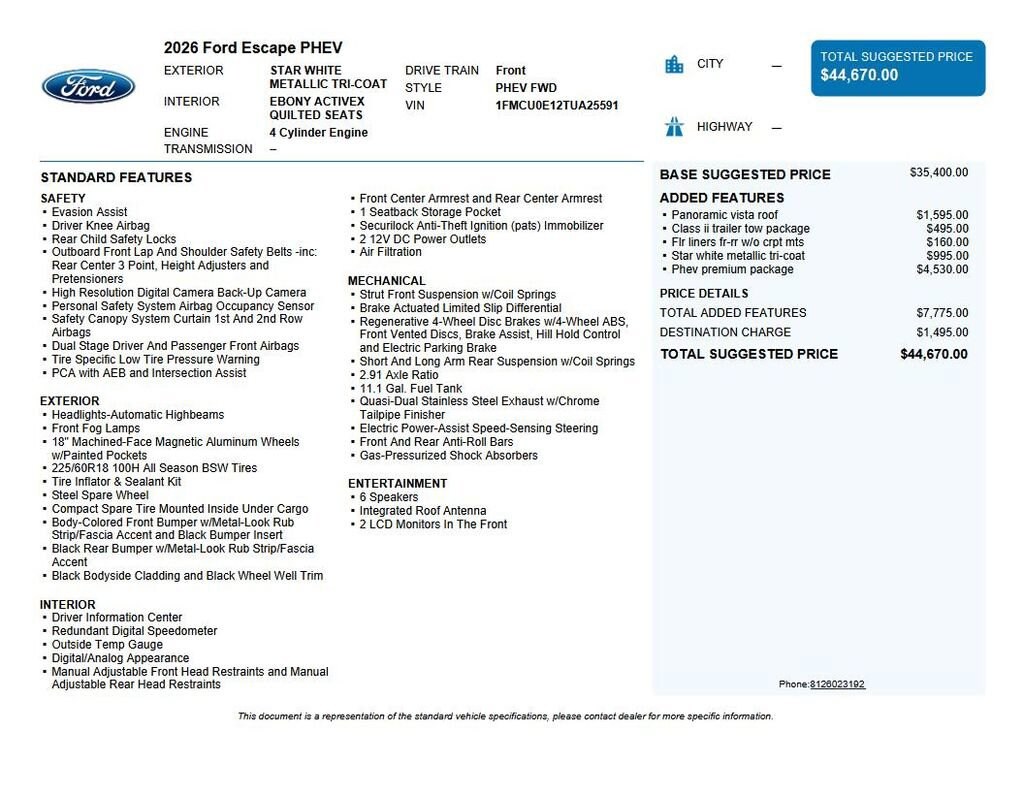 2026 Ford Escape Plug-In Hybrid Base We want you to shop confidently for your next used car at The BIG Ford Store, D-Patrick Ford. We are located on Highway 41 and Walnut in Evansville, right next to the Lloyd Expressway. Buy this used vehicle 100% online or in-store. This pre-owned vehicle was put through an extensive inspection before hitting our lot. Because of this, we are able to offer a 3-month/3,000-mile comprehensive limited warranty. You also get our Love It or Return It 5-day, 300-mile Exchange Policy. See our website for more details on both. We also offer extended service plans, vehicle protection plans, and offer a CarFax vehicle history report. *Prices listed do not include applicable tax, title, tags, license. Prices do include a $250 Documentation Fee and $195 Service & Preparation. All pricing, vehicle information, and features (such as accessories and color) are believed to be accurate, but we do not warrant or guarantee such accuracy. The prices shown above may vary from region to region, and incentives are subject to change. Some offers listed may not be available to all customers. All online sale commitments are subject to confirmation of continued availability of vehicle. Once availability is confirmed, online sale agreement becomes binding upon the parties. If any information found on the website is thought to be erroneous, please verify information with a customer service representative. See dealer for full details. Looking to sell your current vehicle? We buy cars for cash. Every test drive at D-Patrick Ford in Evansville earns $10 to a local charity. Schedule your test drive today! 2.5L iVCT, 10-Way Power Driver's Seat w/Memory, 12.3" Digital Productivity Screen in Instrument Panel Cluster, 2.91 Axle Ratio, 360-Degree Camera with Split View, 4-Way Manual Front Passenger Seat, 4-Wheel Disc Brakes, 6 Speakers, 6-Way Power Front Passenger Seat, 8-Way Power Driver Seat, ABS brakes, ActiveX Trimmed Heated Front Sport Contour Bucket Seats with Quilting Design, Air Conditioning, Alloy wheels, AM/FM radio: SiriusXM 360L, Auto High-beam Headlights, Auto-Dimming Rear-View Mirror, Automatic temperature control, B&O Sound System by Bang & Olufsen, Black Roof-Rack Side Rails, Brake assist, Bumpers: body-color, Class II Trailer Tow Package, Compass, Connected Navigation (1-Year Included), Delay-off headlights, Driver door bin, Driver vanity mirror, Dual front impact airbags, Dual front side impact airbags, Electronic Stability Control, Emergency communication system: SYNC 4 911 Assist, Equipment Group 700A, Ford App, Four wheel independent suspension, Front and Rear Floor Liners Without Carpet Mats, Front anti-roll bar, Front Bucket Seats, Front Center Armrest, Front dual zone A/C, Front fog lights, Front License Plate Bracket, Front Parking Sensors, Front reading lights, Fully automatic headlights, HD Radio, Head-Up Display, Heated door mirrors, Heated front seats, Heated steering wheel, Illuminated entry, Knee airbag, LED Lightbar Headlamps, Low tire pressure warning, Memory Package, Memory seat, Navigation system: Connected Navigation, Neutral Towing Capability, Occupant sensing airbag, Outside temperature display, Overhead airbag, Overhead console, Panic alarm, Panoramic Vista Roof, Partial Vinyl/Cloth Heated Front Sport Contour Bucket Seats, Passenger door bin, Passenger vanity mirror, Perimeter Alarm, PHEV Premium Package, Power door mirrors, Power driver seat, Power Liftgate, Power steering, Power windows, Radio data system, Radio: AM/FM Stereo with SiriusXM 360L, Rear anti-roll bar, Rear Parking Sensors, Rear reading lights, Rear seat center armrest, Rear window defroster, Rear window wiper, Remote keyless entry, Reverse Brake Assist, Speed control, Speed-sensing steering, Speed-Sensitive Wipers, Split folding rear seat, Spoiler, Steering wheel mounted audio controls, SYNC 4 with Enhanced Voice Recognition, Telescoping steering wheel, Tilt steering wheel, Traction control, Trip computer, Universal Garage Do